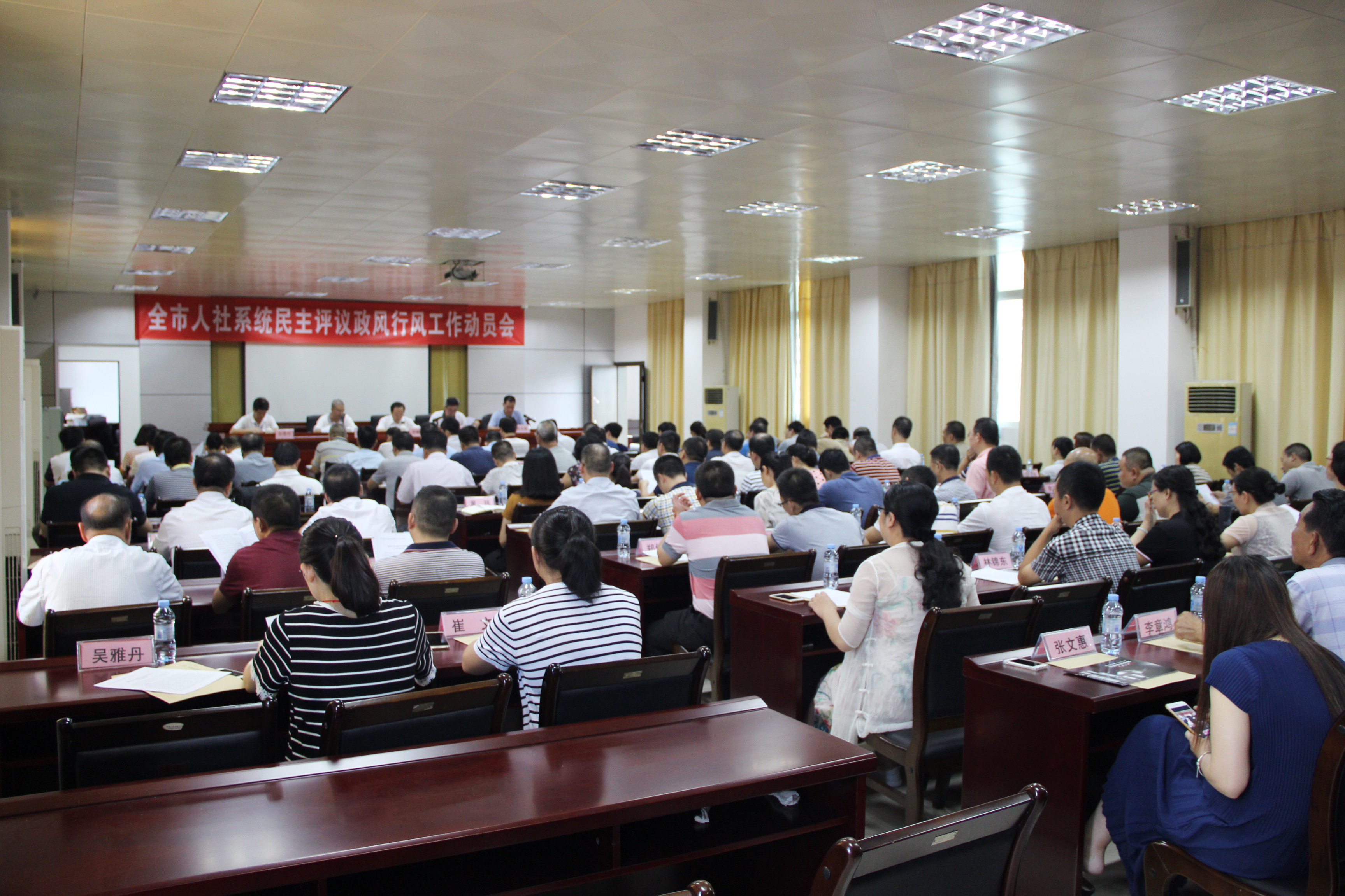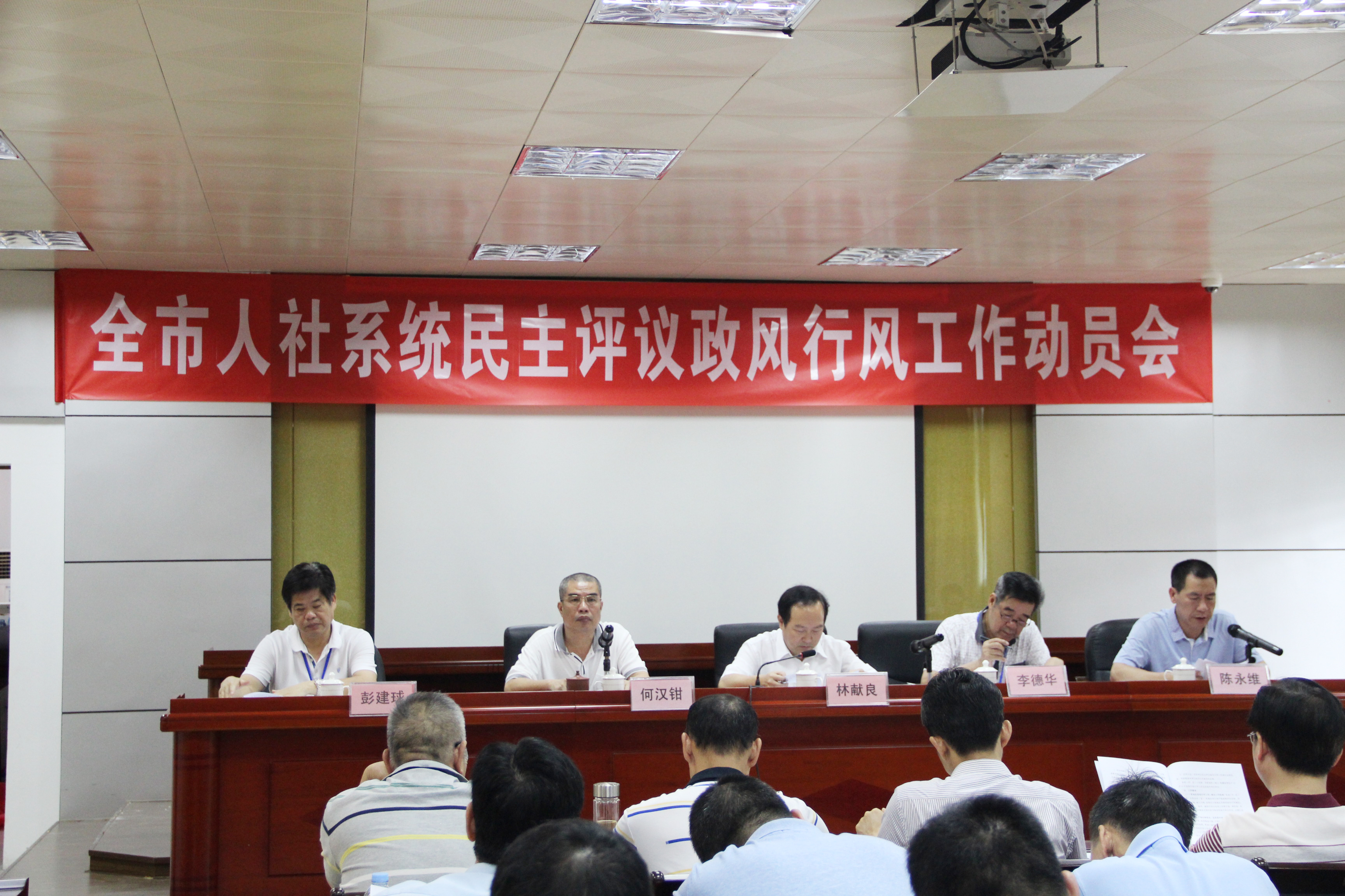 6月30日,市人社局召开全市人社系统民主评议政风行工作动员大会,传达学习2017年市直民主评议政风行风工作动员会议精神,研究部署全市人社系统民主评议政风行风工作。市人社局机关全体干部职工,各县(市、区)人社局、社保局主要负责同志,市社保局、市就业中心、市技工学校中层以上干部近120人参加会议。市委组织部副部长、市人社局局长林献良同志作动员报告,市行评督导组全体成员参加会议,市行评督导组组长、原市委副秘书长、市接待处处长李德华同志作了重要讲话。